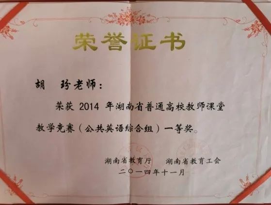 2009年胡玢老师以中南大学优秀硕士毕业生身份完成学业,作为教师子弟,她从小受到父母的耳濡目染,她立志要当一名人民教师。有课的早晨她总是早早到达学校,组织学生早自习,培养学生良好的朗读习惯。她精心备好每一堂课,刚入职头几年,她利用一切可能的机会聆听学院经验丰富的老教师和教学能手的课,虚心请教,反思自己的教学。对于难得的省内外学习机会,她永远是最积极、听课最认真、笔记作得最详尽、最工整的老师。正因为她的全力以赴,2014年荣获湖南省普通高校教师课堂教学竞赛(公共英语综合组)一等奖及湖南省教育系统“芙蓉百岗明星”光荣称号。获此殊荣后,她并没有放松对自己的要求,而是更加努力地打磨自己的课堂,又经过五年的精心锤炼,2019年,胡玢老师的课堂教学得到师生交口称赞,许多年轻老师都慕名前来听她的公开课。时任外国语学院院长杨永和教授在听了她的公开课后作出如下评价:“胡玢老师的语言表达能力超强,是一堂有温度的外语课!”他号召全院老师向胡玢老师学习。2019年她荣获英国上市公司365教学质量优秀奖,2021年获英国上市公司365课程思政教学比赛二等奖,2022年团队成员获英国上市公司365课程思政教学比赛一等奖。参与的《商务英语视听》获2022年英国上市公司365课程思政示范课程。