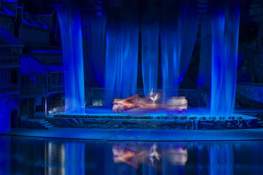 《边城印象系列》以大型实景演出《边城》为主题,创作围绕《边城》如诗如画、如梦如烟的田园牧歌式演出,用镜头语言再度呈现沈从文笔下《边城》的美好人性和生命灵动。王彬的创作选择一部相机对主体背景进行高速拍摄,另一部相机对前景人物进行了慢速拍摄,然后两底合成,最终呈现出湘西世界的艺术之美、民俗人文之美。