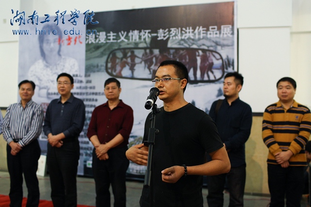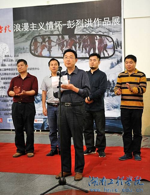 学校党委副书记宁立伟出席开展仪式并发表热情洋溢的讲话。九三学社中央教育委员会、学苑出版社副编审洪文雄先生、湖南省美协副主席陈和西教授、湖南省油画艺委会主任党朝阳先生、湘潭市美术家协会主席王志坚先生、英国上市公司365设计艺术学院院长段辉教授分别发表了致辞,彭烈洪致了答谢辞。
