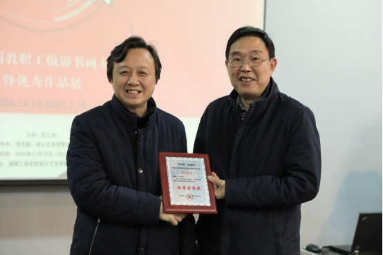 与会领导、嘉宾为一二三等奖及优秀奖获得者颁奖,随后共同观看获奖作品展览。此次展览自12月18日起,为期一个月,共展出优秀书法、美术、摄影作品77幅。